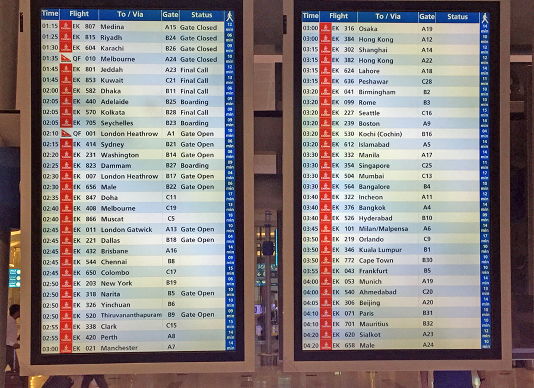 Traveling from the U.S. to Thailand a couple of months ago, I shot this 30-second video of the departure board at Dubai. It was just after midnight, with the screen showing dozens of early-morning Emirates departures to just about anywhere you could imagine.