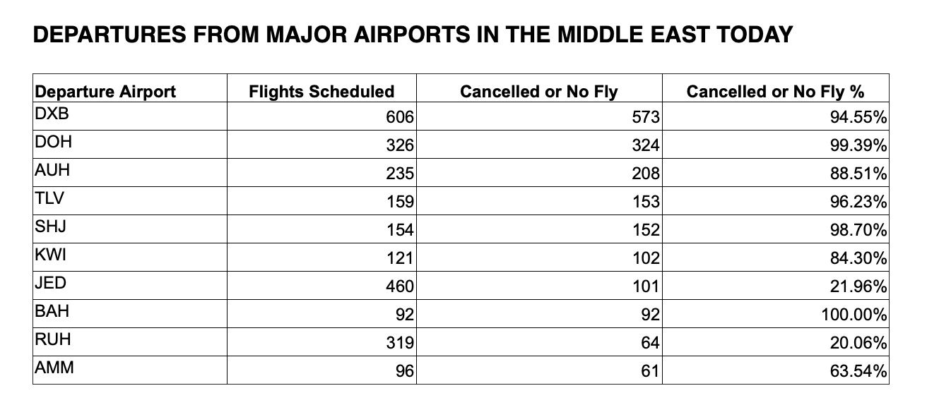 The sudden conflict with Iran has brought Persian Gulf air traffic to a halt. Emirates, Qatar Airways, and Etihad have seen greater than 90 percent of their flights curtailed, leaving hundreds of thousands of people stranded.