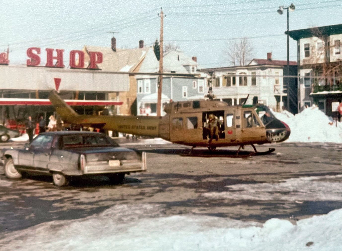 This photo was taken on February 10th, 1978. It shows a National Guard copter that just touched down (or maybe it was departing; I really don’t remember) in the parking lot of the Stop & Shop in Revere, Massachusetts. This was three days after the famous “Blizzard of ’78.” The area was still paralyzed, and the Hueys were bringing in essentials and soldiers.
