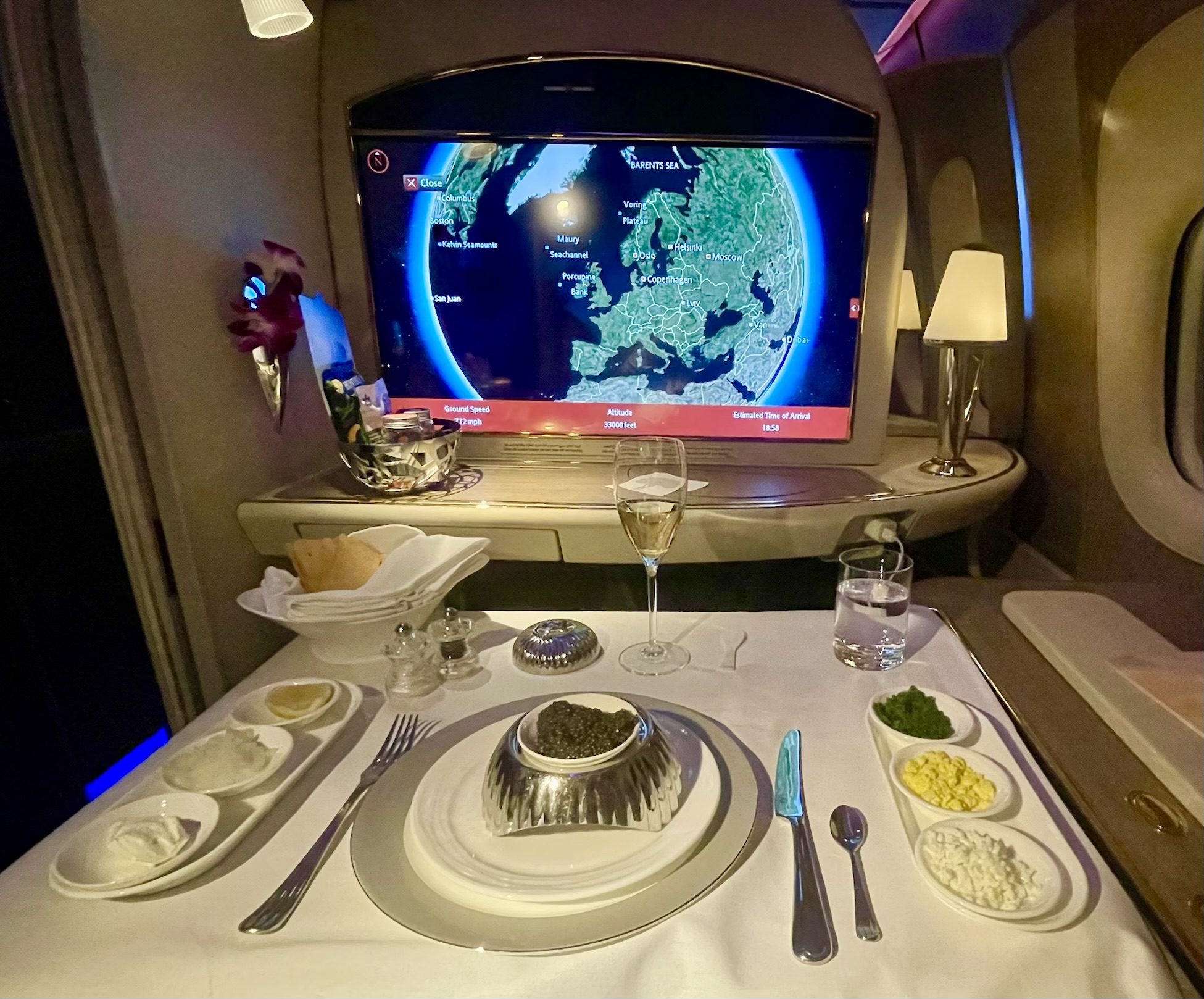 Bangkok-bound caviar spread in Emirates first class. An extravagant use of some SkyWards miles, but too much fun to refuse.